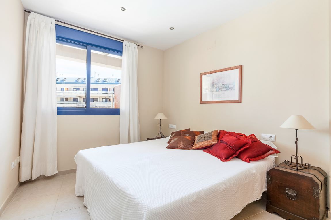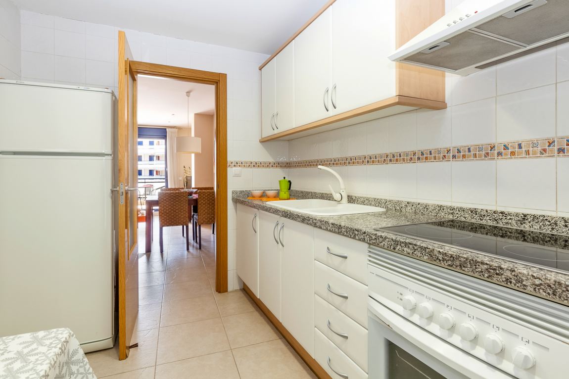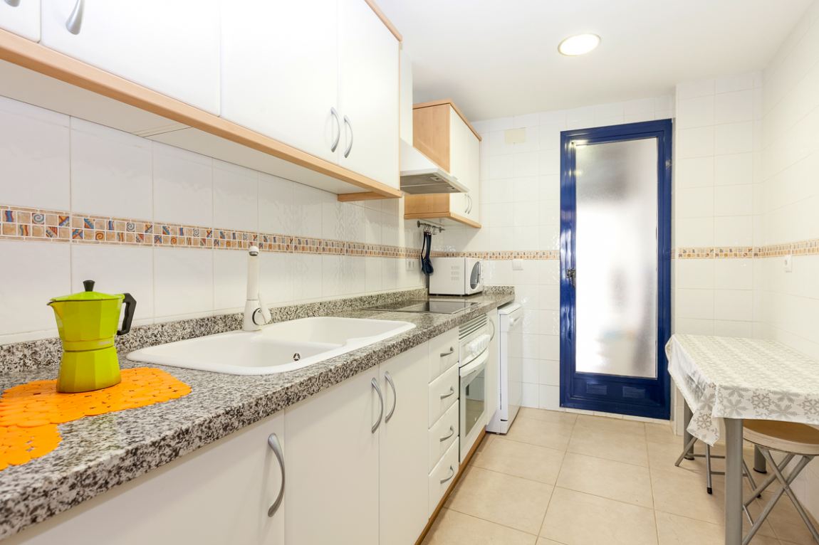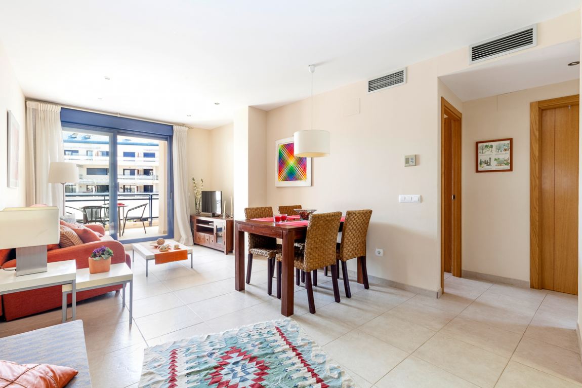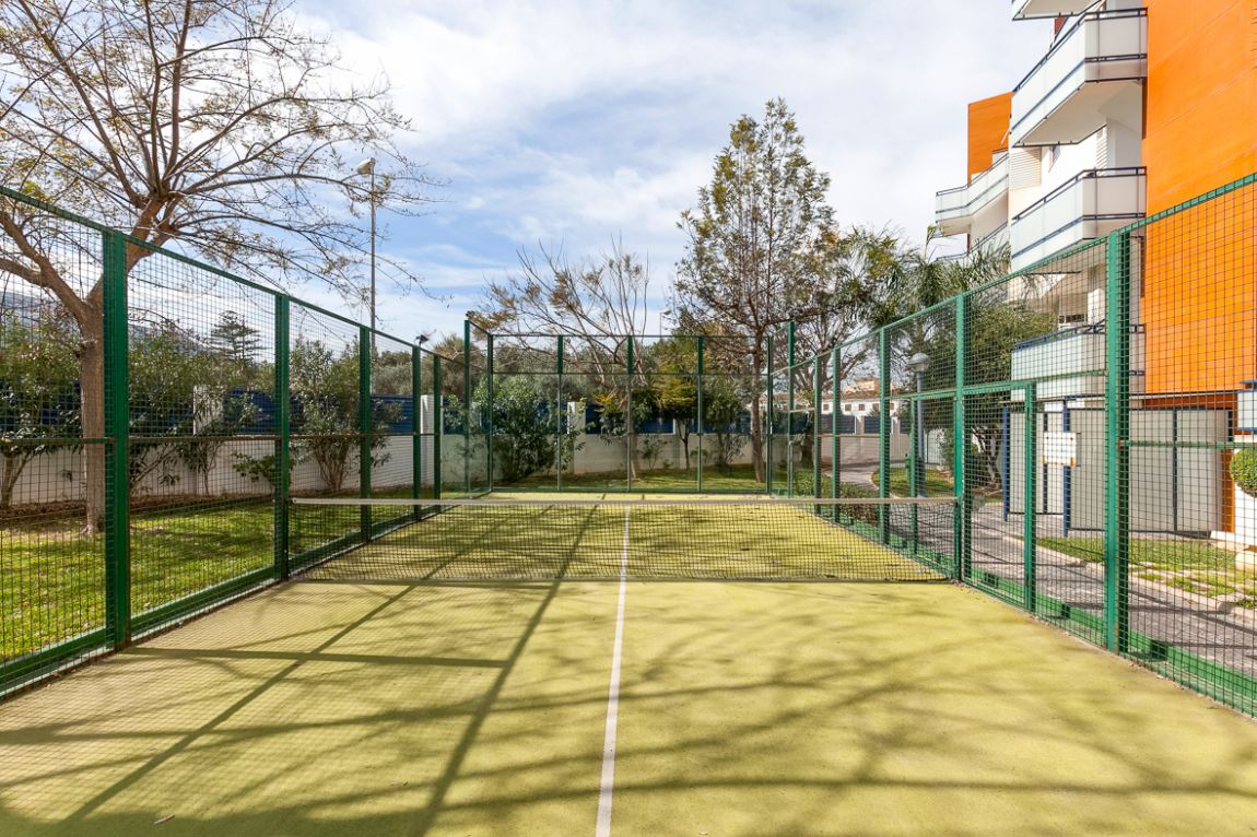 Moderno apartamento para cuatro personas a escasos metros de la playa de arena de la Marineta en Dénia. Está ubicado en un acogedor complejo residencial con piscina comunitaria, parque infantil y pista de pádel, sauna y gimnasio, perfecto para familias con niños. El apartamento tiene 80 m2 distribuidos en una habitación de matrimonio con cama de 150cm, habitación con dos camas de 90cm, cocina independiente, lavadero con lavadora y tendedero, salón comedor con salida una amplia terraza con vistas a las zonas comunes y al mar. Incluye plaza de garaje subterráneo con acceso directo a la vivienda. Wifi y aire acondicionado por conductos.