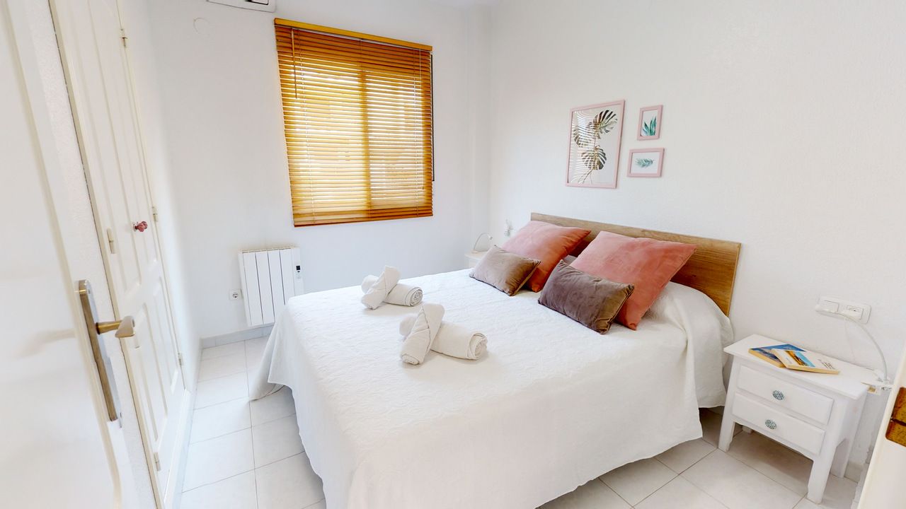 Fabuloso apartamento en planta baja con capacidad para 4 personas. A/A. Espacioso y luminoso salón comedor con cocina office bien equipada. Salida directa a la amplia terraza con acceso a la zona común, jardín y gran piscina comunitaria para disfrutar del sol. Dispone de 2 hab. dobles, una con cama de matrimonio (150cm) y otra con 2 camas individuales (90cm.) Orientación este y oeste muy fresca en verano. La vivienda dispone de ventiladores, calefacción eléctrica, Wifi y parking comunitario.  La urbanización es familiar tranquila y muy agradable, ideal para viajar en pareja o con niños.