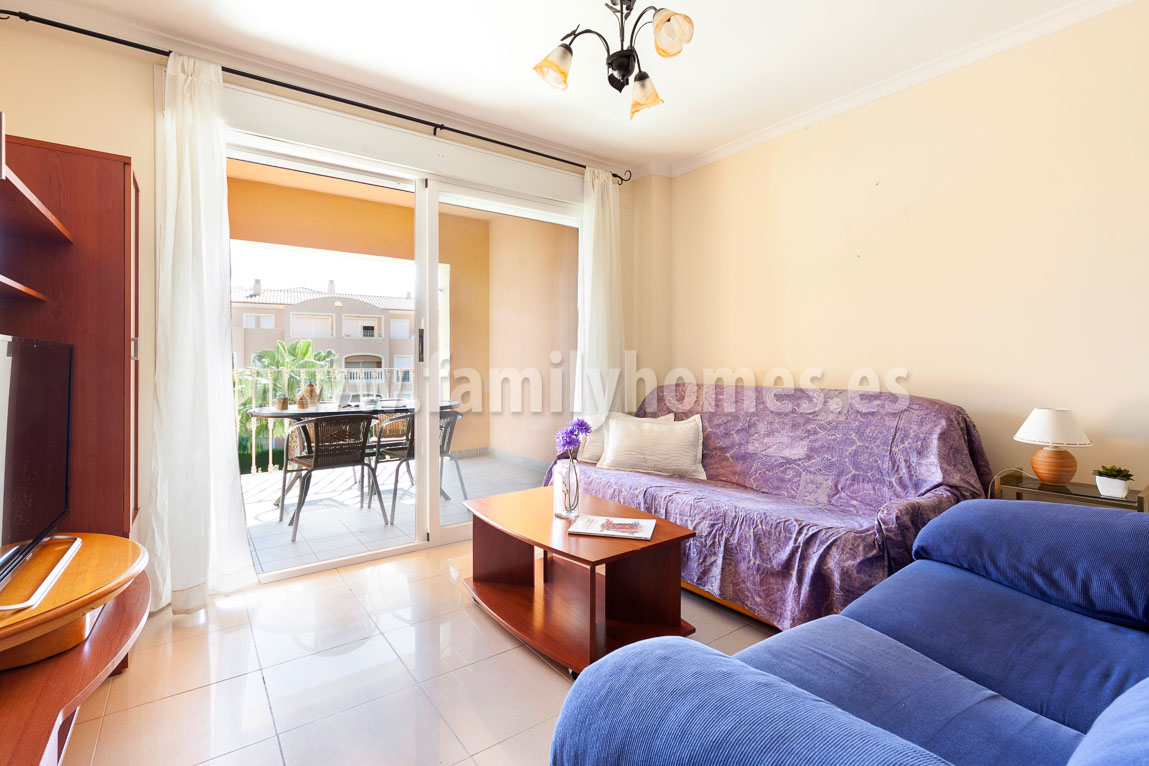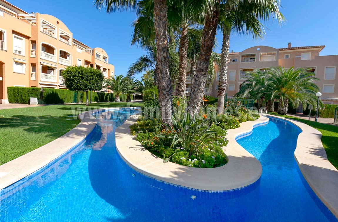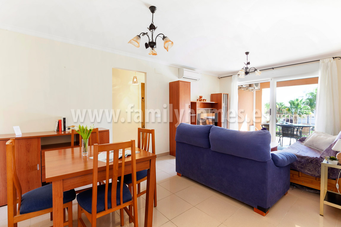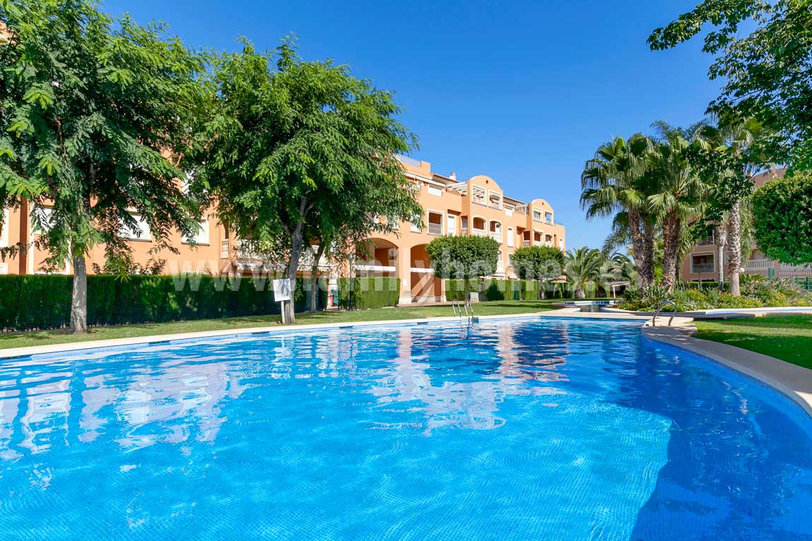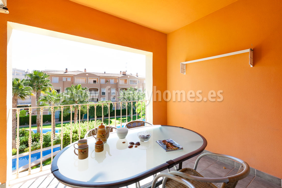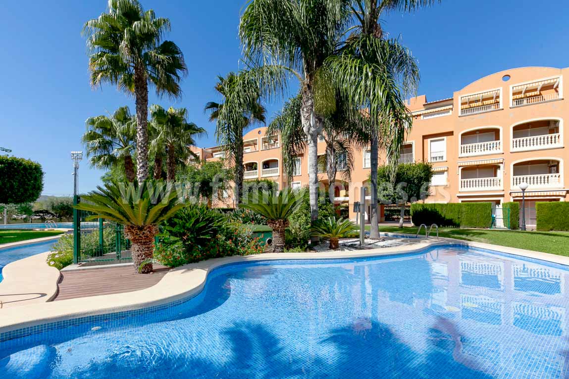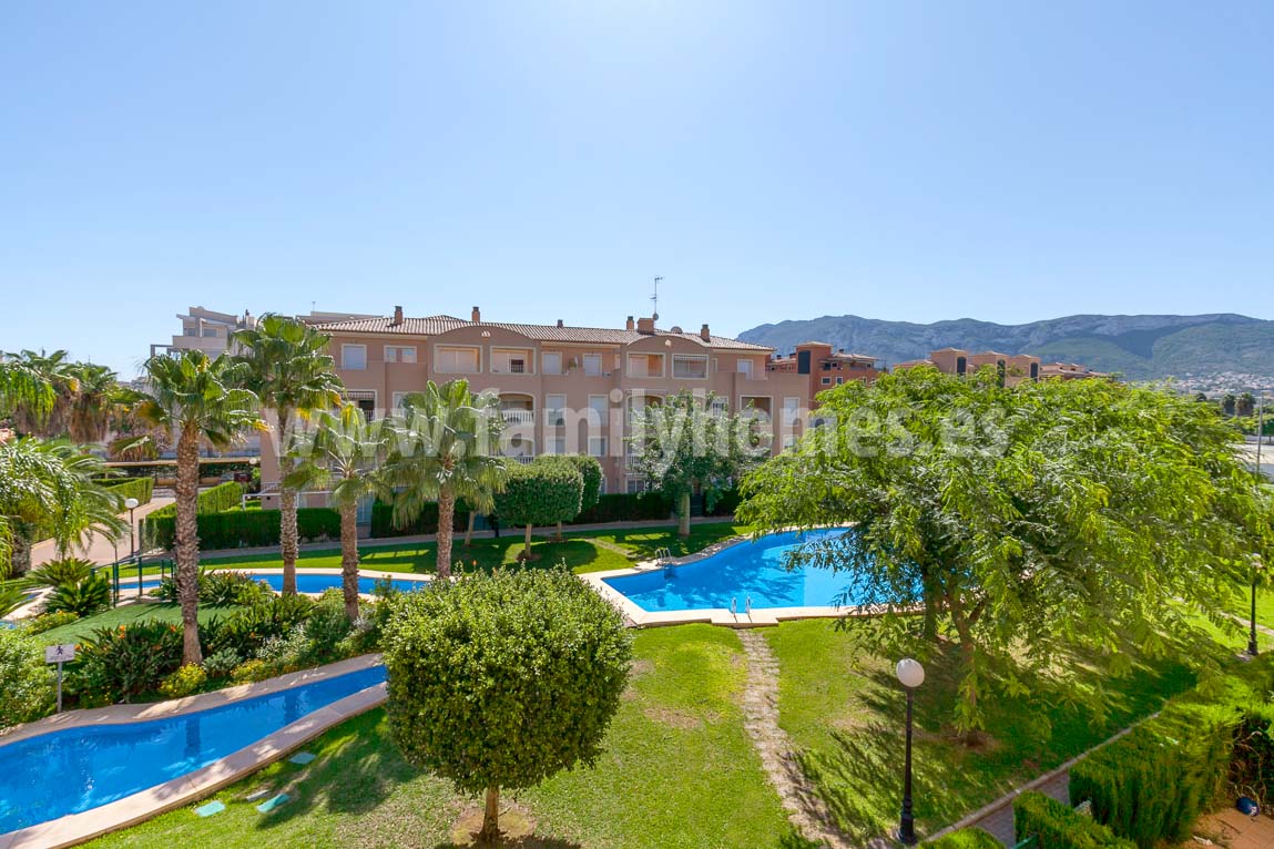 Luminoso apartamento para 4 personas en Dénia, situado a 400 m. de la playa de arena de Las Marinas en una familiar y tranquila urbanización. La vivienda, con 70 m2, dispone de dos habitaciones dobles, una con cama de matrimonio y otra con dos camas individuales, baño con bañera, aseo, cocina independiente, salón comedor y una agradable terraza con unas magníficas vistas a la zona común. El complejo cuenta con una gran piscina comunitaria, piscina infantil, jacuzzi, jardín mediterráneo y plaza de parking privada.