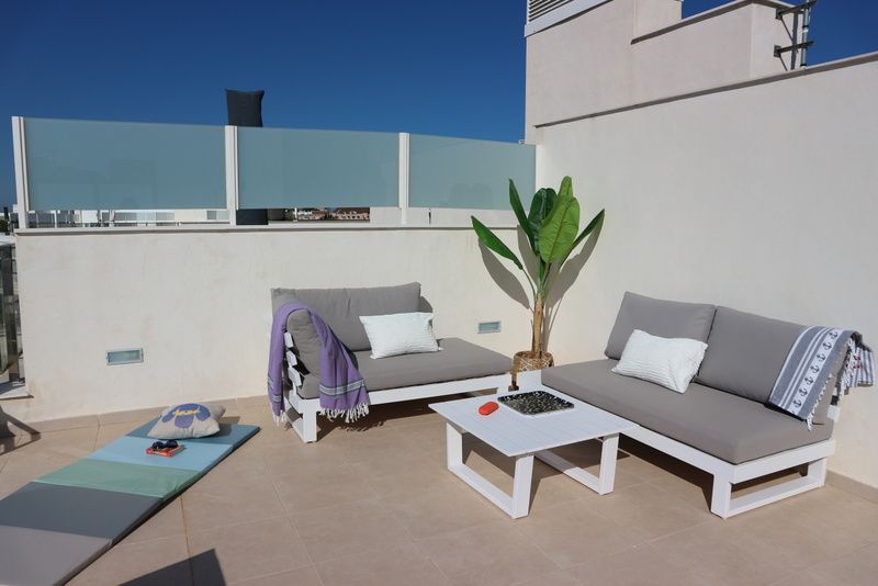 En la planta superior encontramos el gran solárium de 50m2 equipado con zona chill out con sofás y mesa con capacidad para 6 comensales. Dos tumbonas. Desde ella se puede disfrutar de unas impresionantes vistas al Parque Natural del Montgó, un entorno natural de más de 2.100 hectáreas. Para que disfrutes de los más de 300 días de sol al año que se registran en Denia.