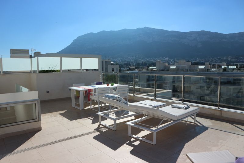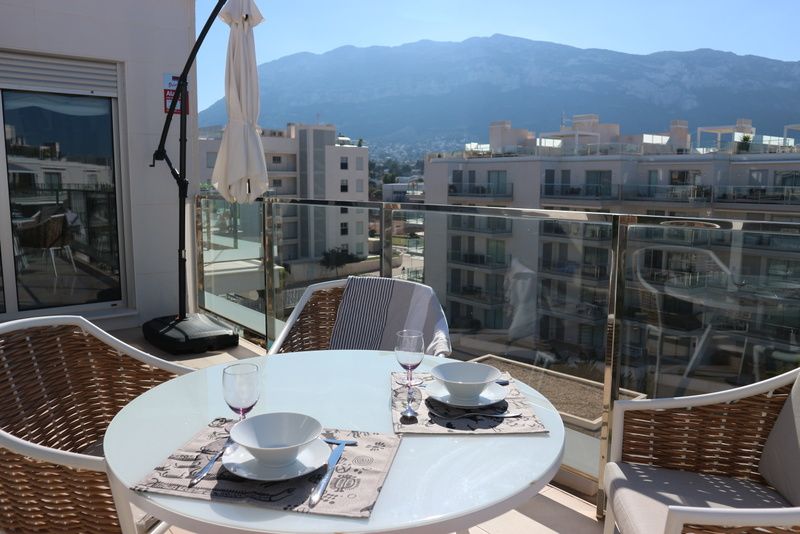 Fantástico ático de nueva construcción con capacidad para 4 personas, dos habitaciones dobles y dos baños. Distancia a pie del centro urbano de Denia y de la playa de arena. Con dos terrazas, una de ellas gran solárium de 50m2 en Dénia. Vistas abiertas al Montgó y orientación suroeste, muy luminoso y soleado. Decorado con gusto. Dispone de garaje, ascensor, alarma, puerta de seguridad, WIFI, Fibra óptica. Aire acondicionado por conductos y calefacción central. La urbanización cuenta con piscina, gimnasio, club social, parque infantil y parking para bicicletas.
