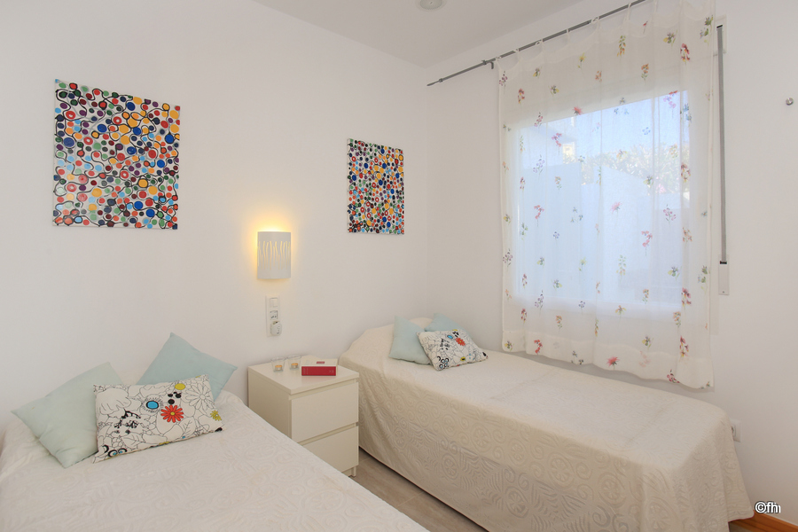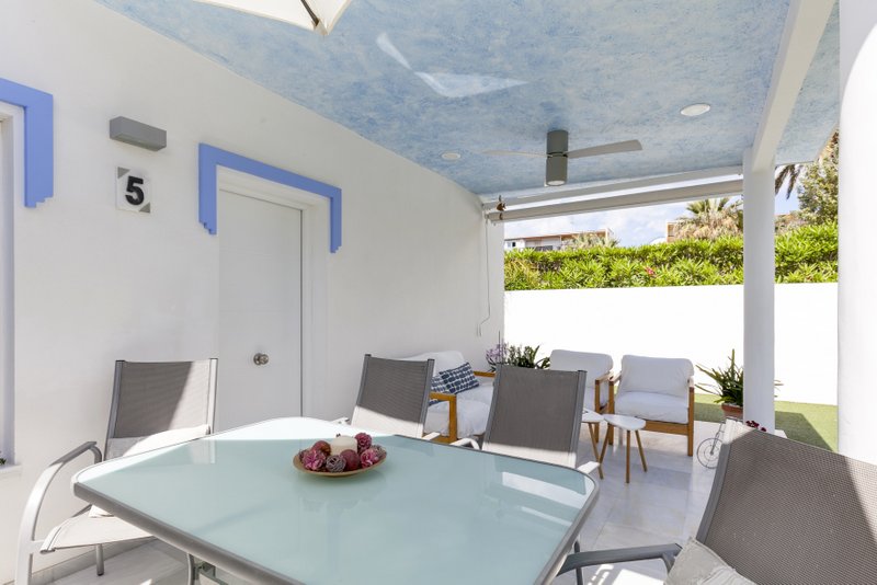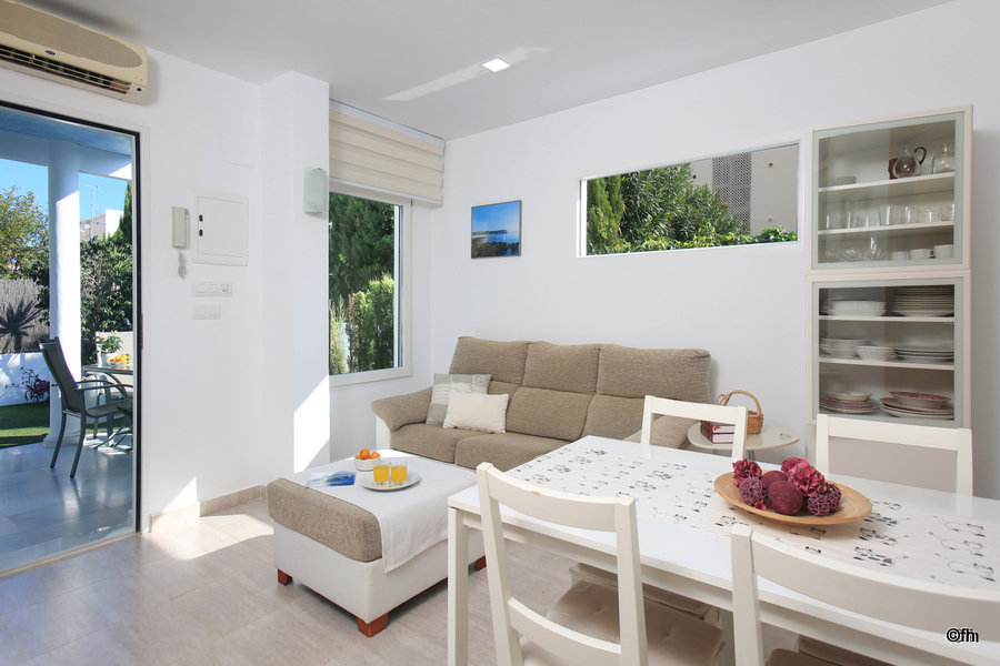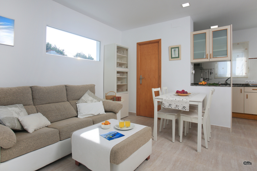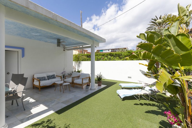 Coqueta villa independiente para cuatro personas en Dénia ubicada en una tranquila urbanización familiar con acceso directo a la playa de arena. Esta acogedora vivienda dispone de un amplio salón-comedor con acceso directo al jardín privado, cocina abierta, habitación de matrimonio con cama de 135, habitación doble con dos camas individuales y un baño con ducha. La casa cuenta con dos terrazas, una cubierta de 30 m2 cuidadosamente amueblada y otra descubierta de 20 m2, jardín con césped artificial, barbacoa, ducha exterior de agua caliente, plaza de parking junto a la casa, wifi y tv satélite.