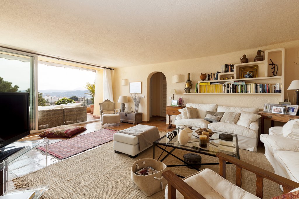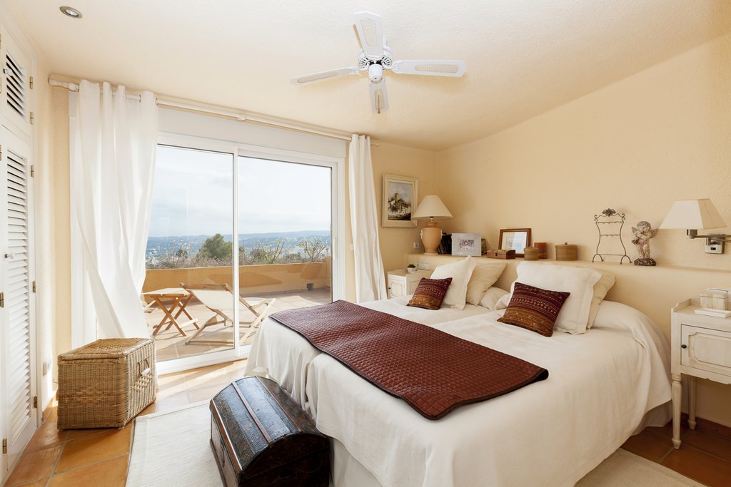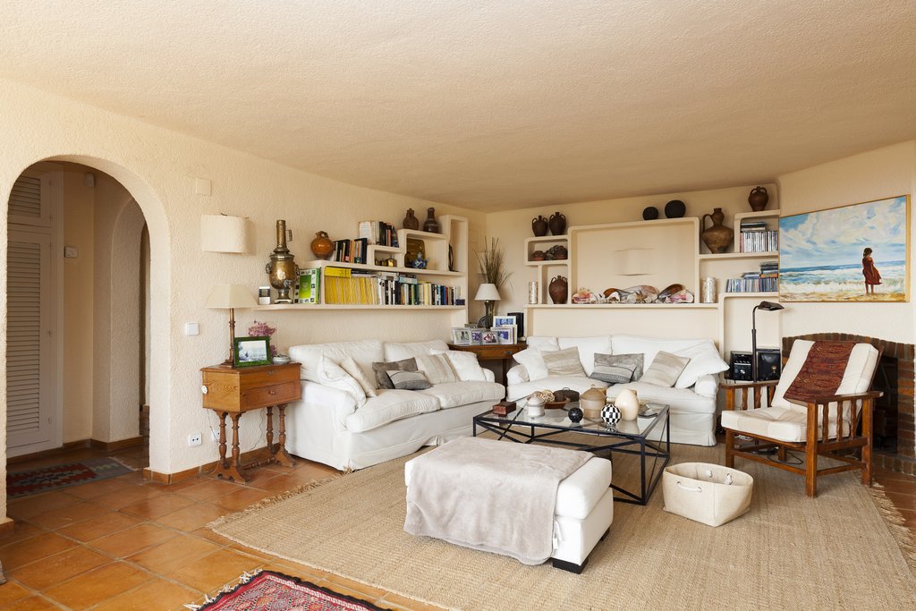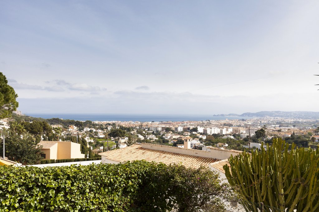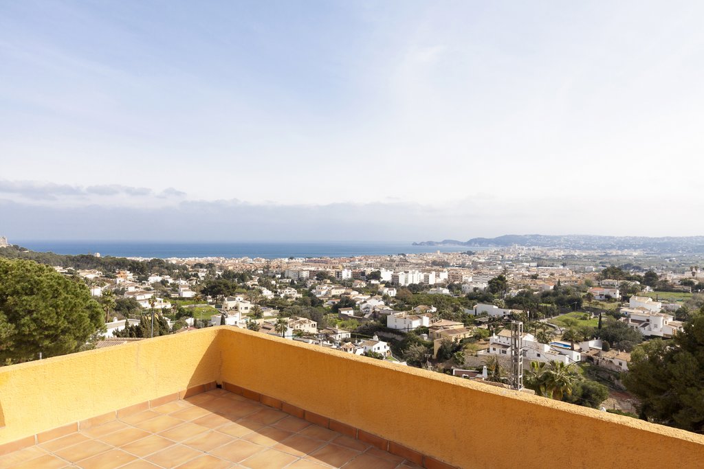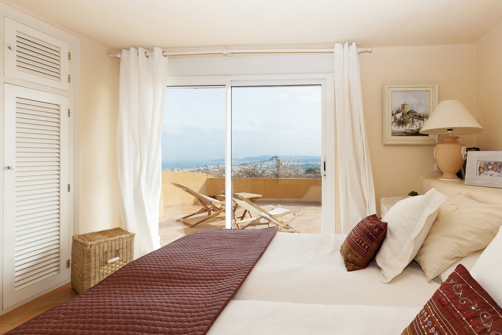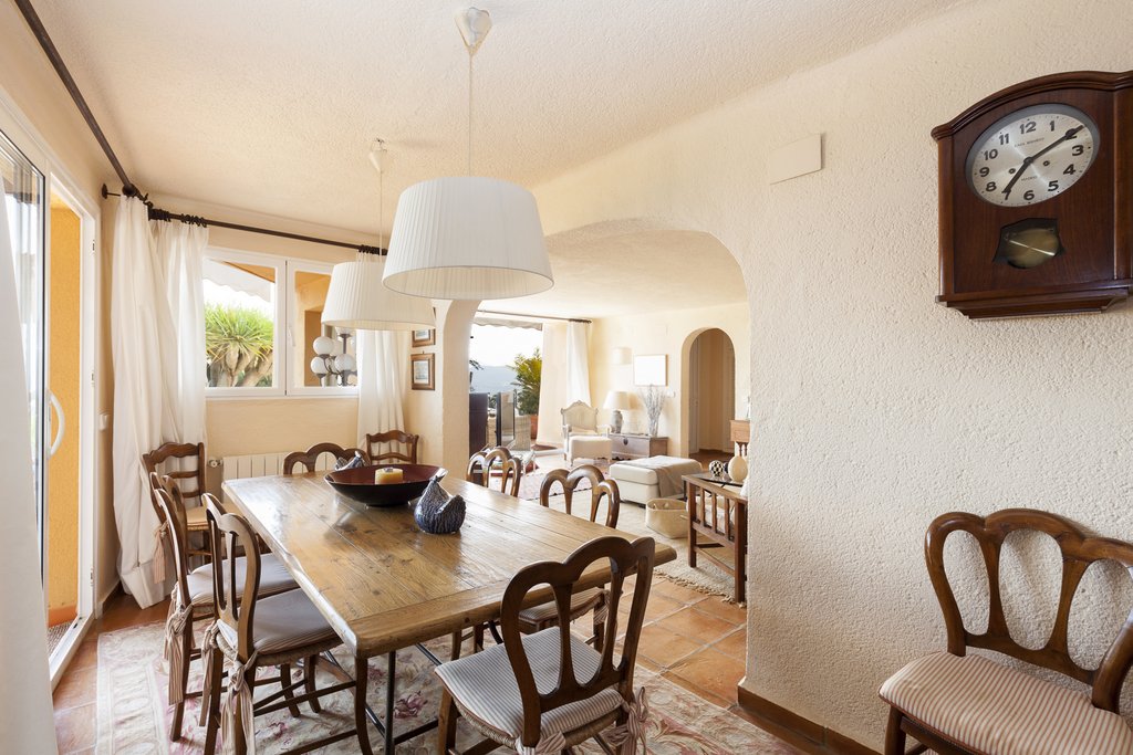 Lujosa Villa Mediterránea de diseño en Jávea con vistas panorámicas al mar de 180º para 10 personas, perfecta para vacaciones en familia. La casa cuenta con dos plantas. En la planta baja está la zona de día: un amplísimo y coqueto salón comedor, una gran cocina con salida exterior y un aseo. Subiendo unos pocos escalones se accede a un entresuelo en el que se encuentra dos habitaciones dobles, una con cama de matrimonio y otra con dos camas individuales y dos baños completos, uno con bañera y otro con ducha.