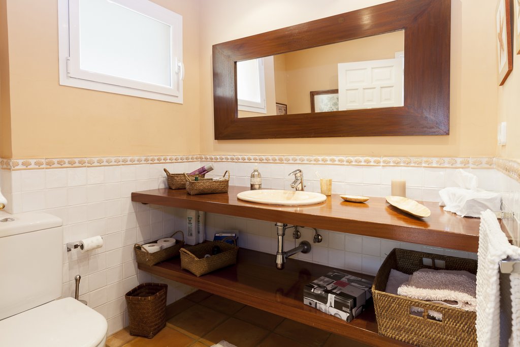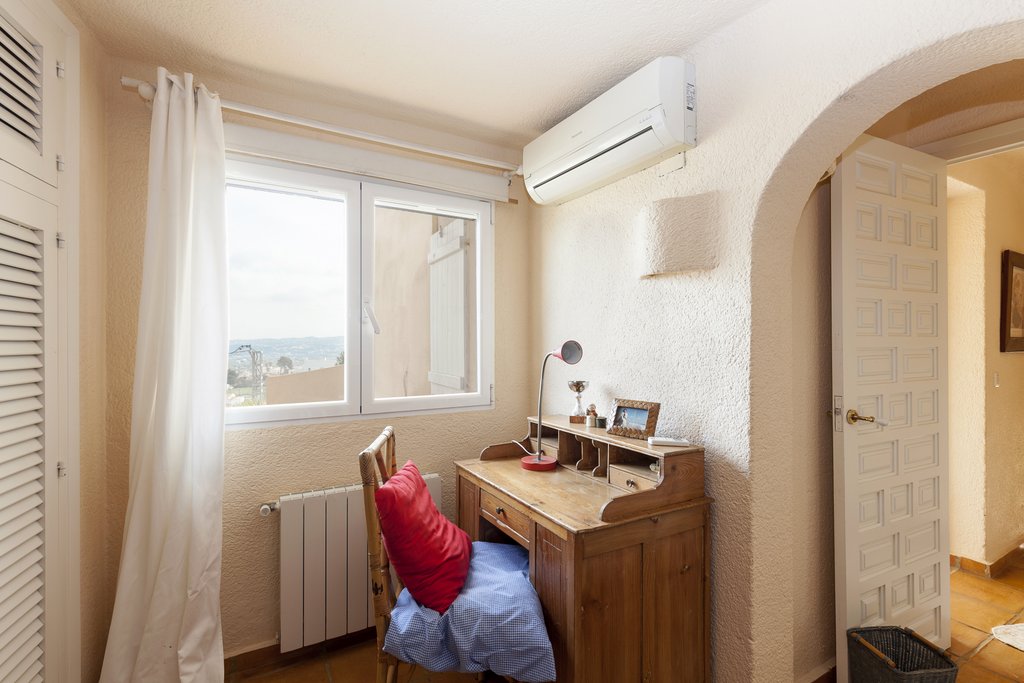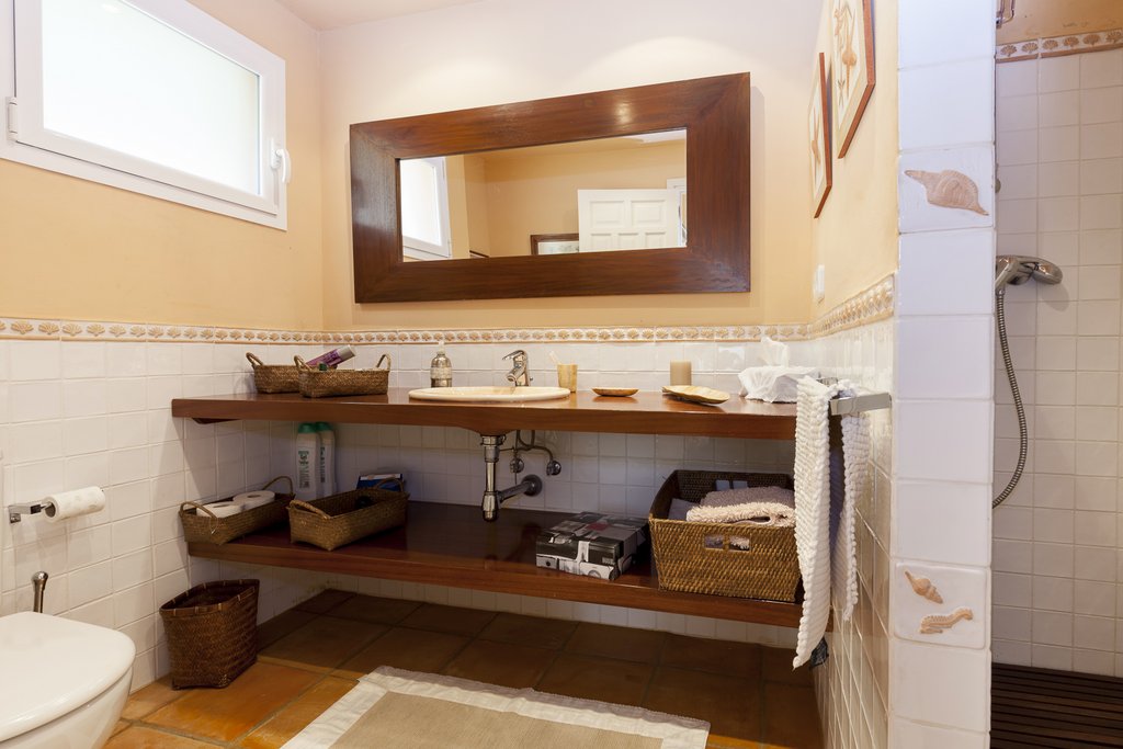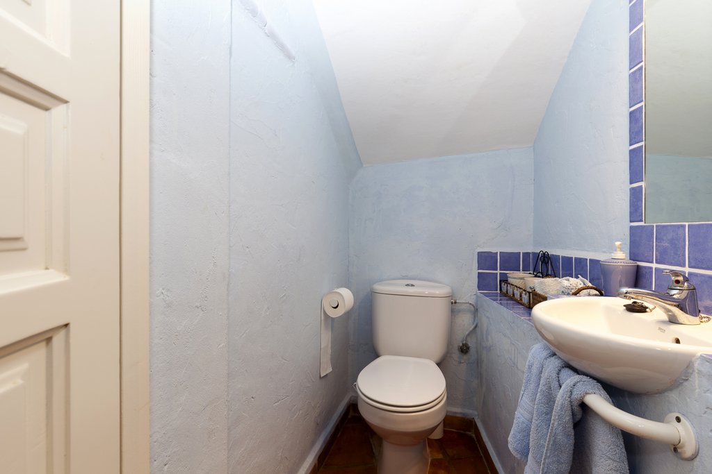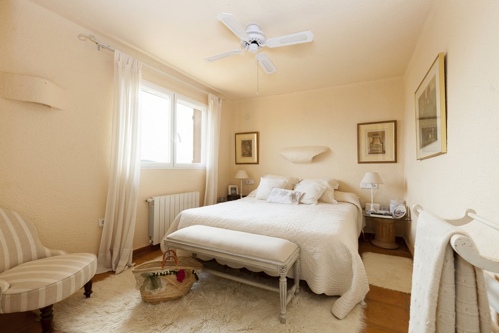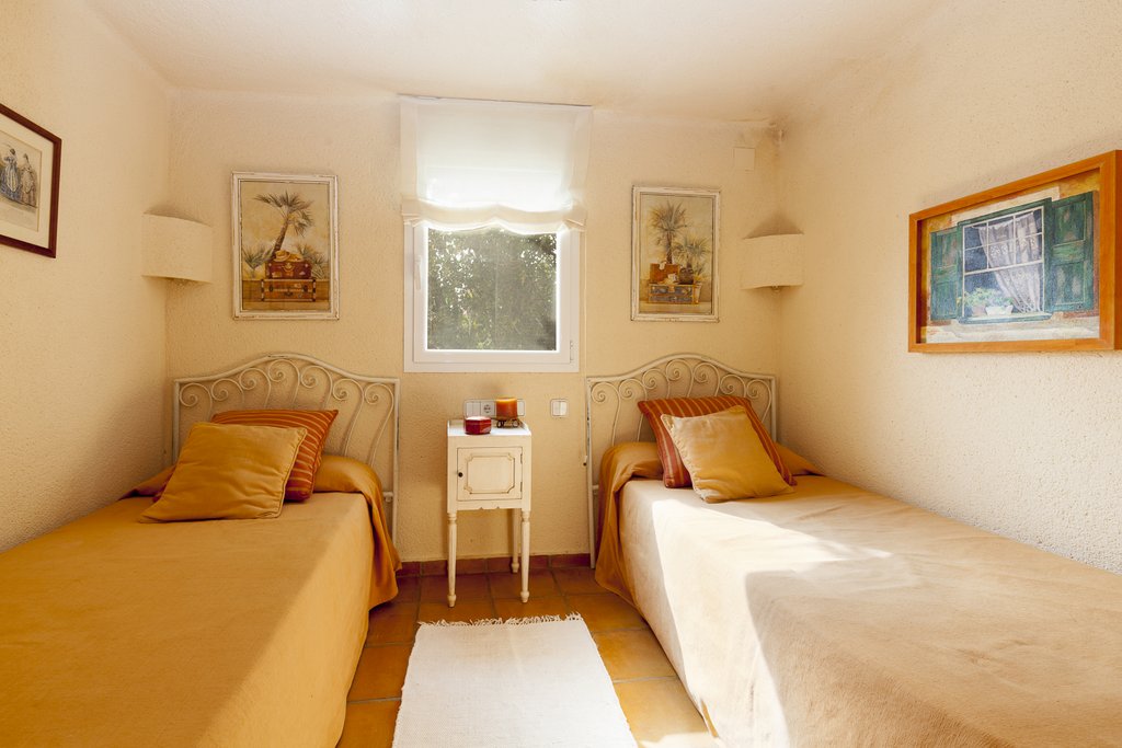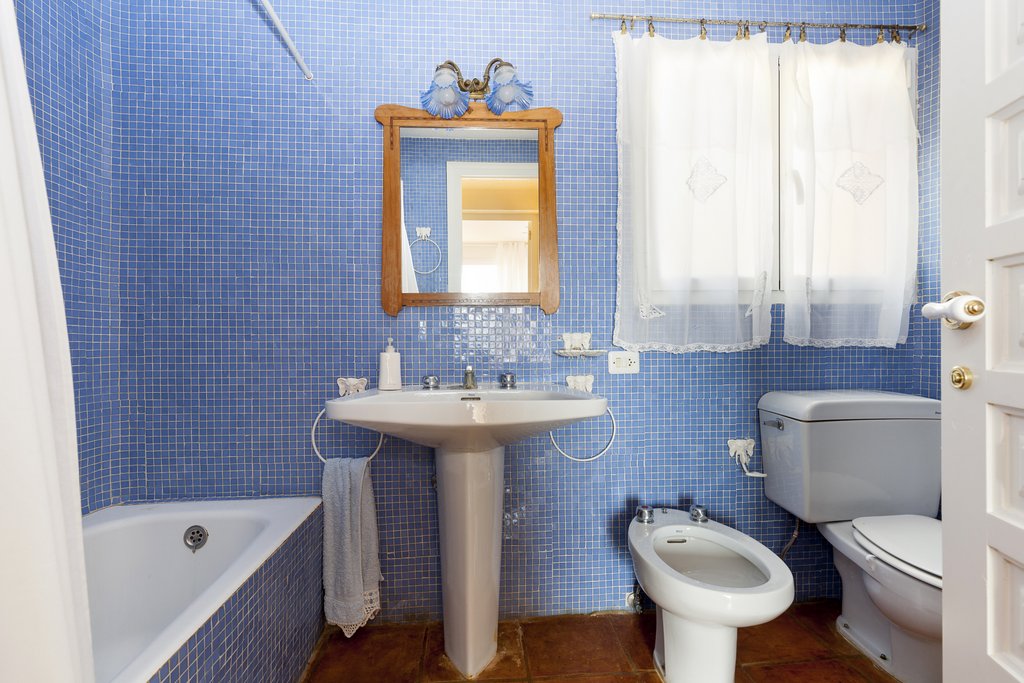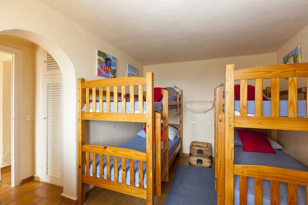 En la planta superior, están el resto de habitaciones: una habitación doble con cama de matrimonio de 180cm y salida privada a la terraza con vistas panorámicas al mar, una cuádruple con literas y un baño con bañera.