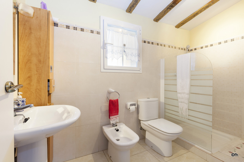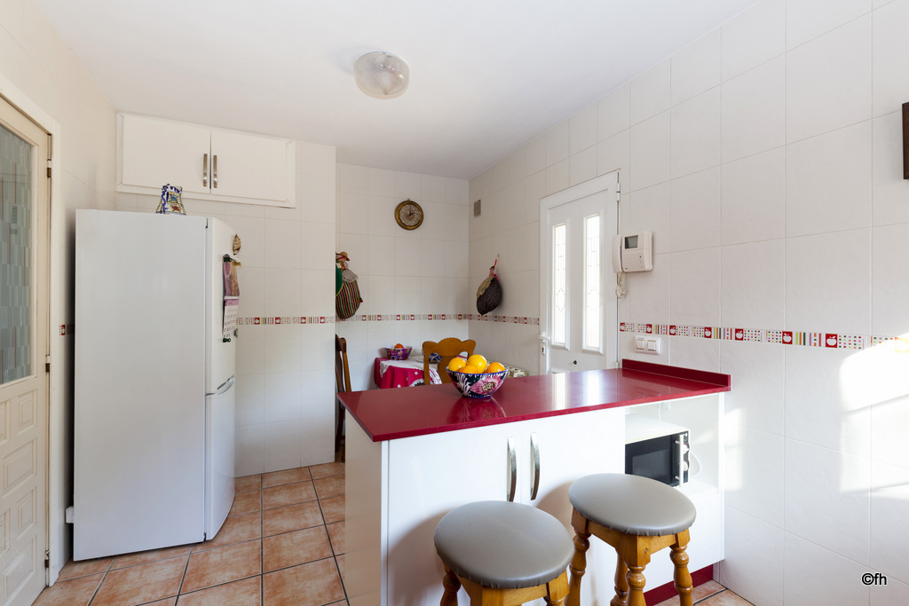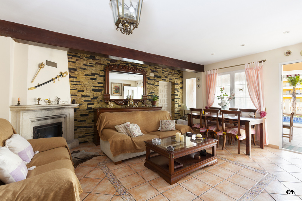 Cuenta con una gran terraza cubierta equipada con mobiliario exterior junto a la piscina, ducha exterior, tumbonas, barbacoa cubierta perfectamente equipada con nevera, etc.