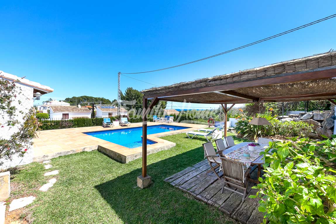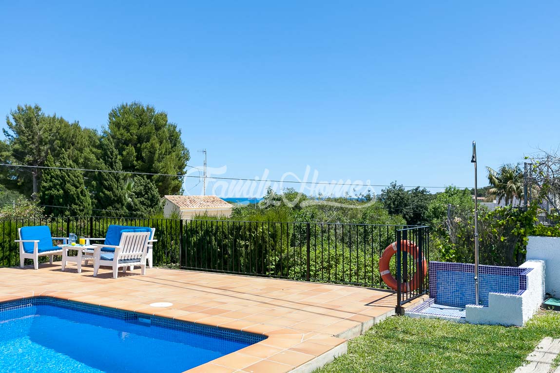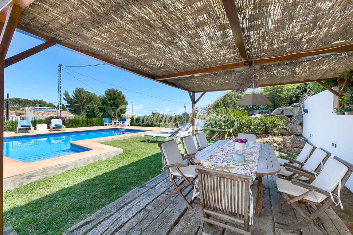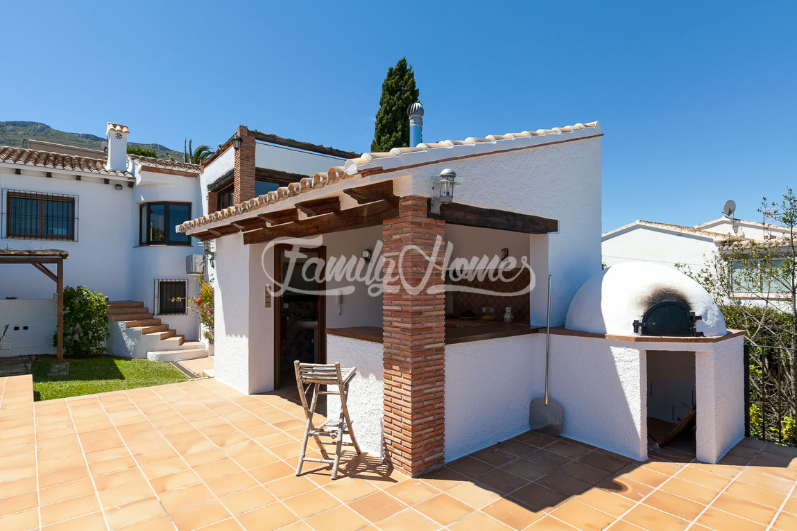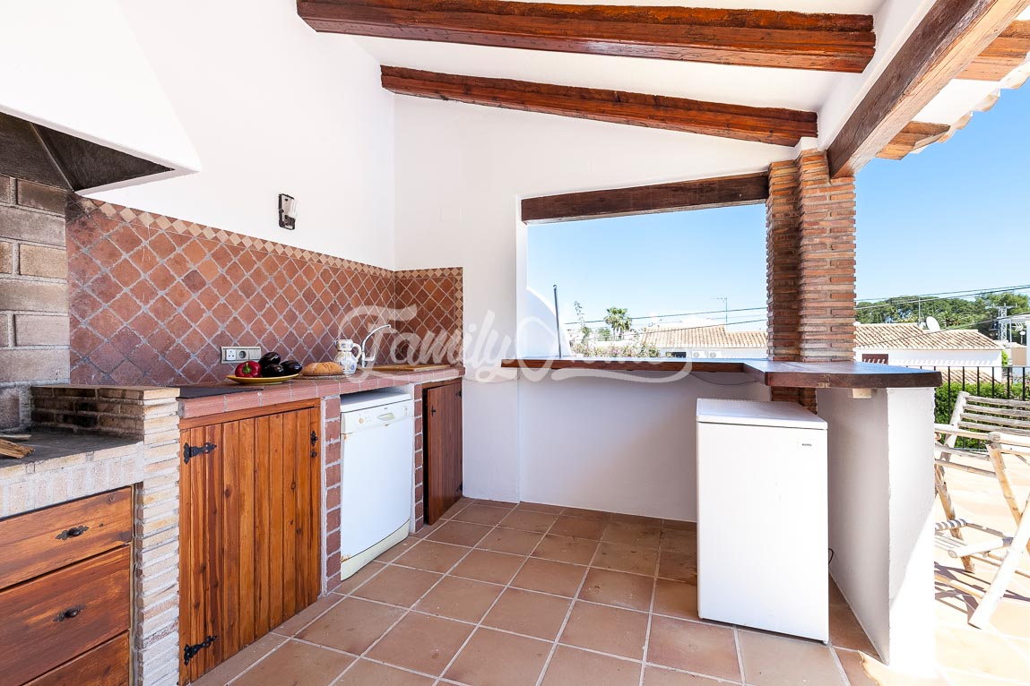 En la zona exterior, dispone de una fantástico porche cubierto con mobiliario de terraza ideal para comer y cenar, disfrutando de unas fantásticas vistas abiertas y al mar. Junto a la piscina encontramos la barbacoa cubierta bien equipada con vajilla completa, nevera, horno de leña y barra americana. Aseo y ducha exterior. Jardín mediterráneo con arboles frutales y otros. Plaza de parking en el interior de la parcela con puerta automática de entrada.
