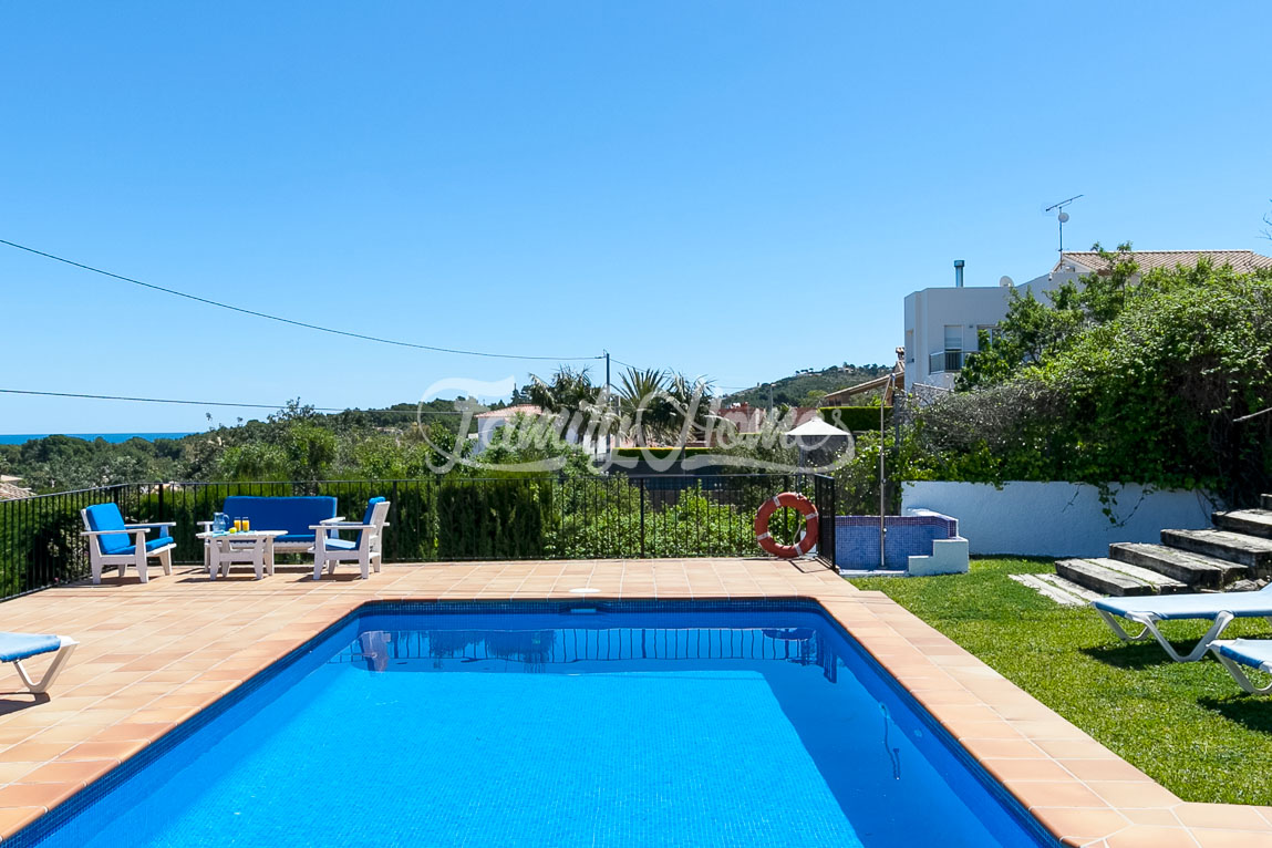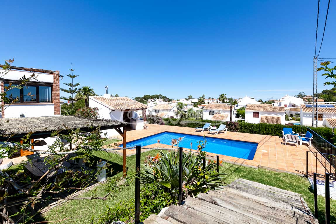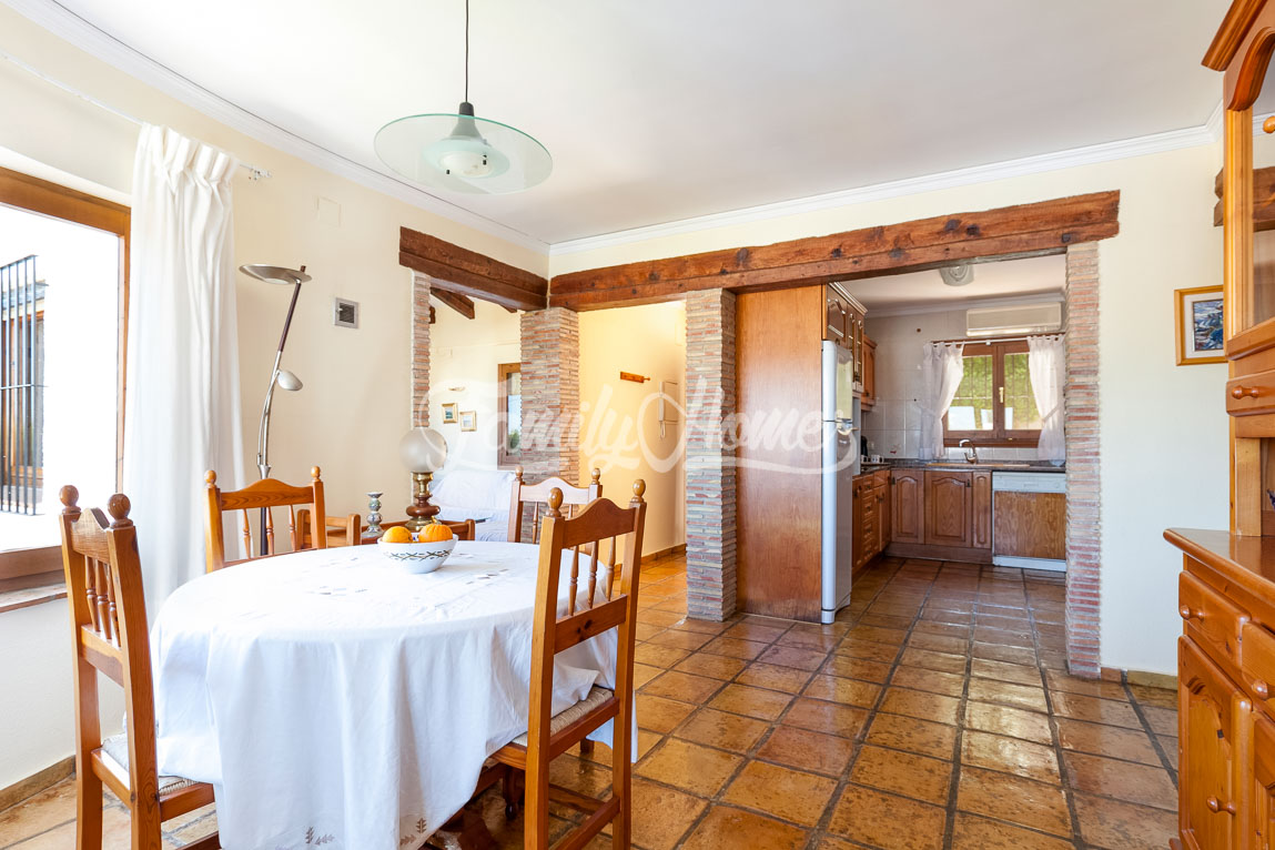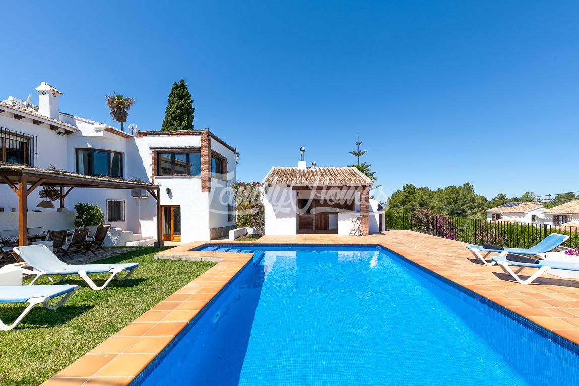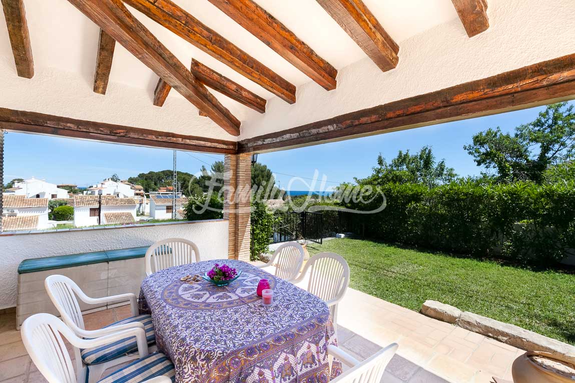 En la zona exterior, dispone de una fantástico porche cubierto con mobiliario de terraza ideal para comer y cenar, disfrutando de unas fantásticas vistas abiertas y al mar. Junto a la piscina encontramos la barbacoa cubierta bien equipada con vajilla completa, nevera, horno de leña y barra americana. Aseo y ducha exterior. Jardín mediterráneo con arboles frutales y otros. Plaza de parking en el interior de la parcela con puerta automática de entrada.