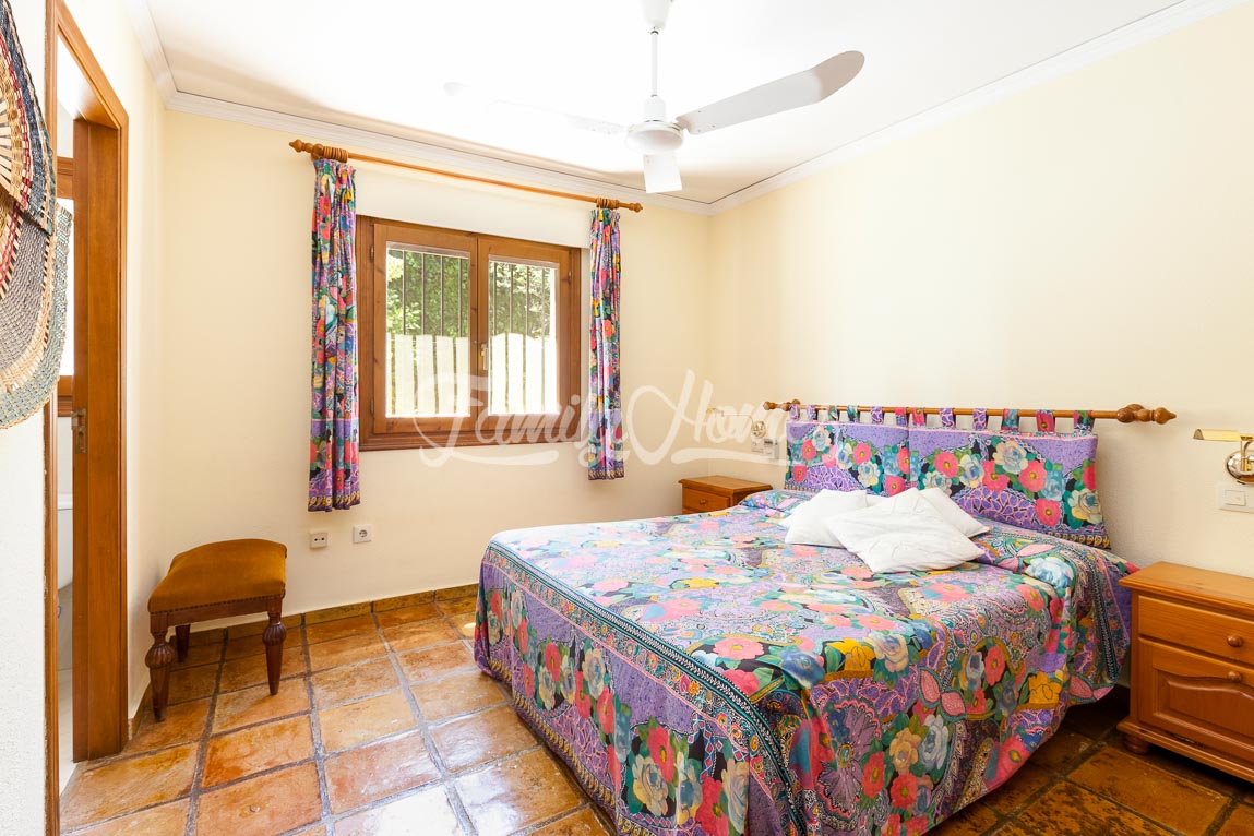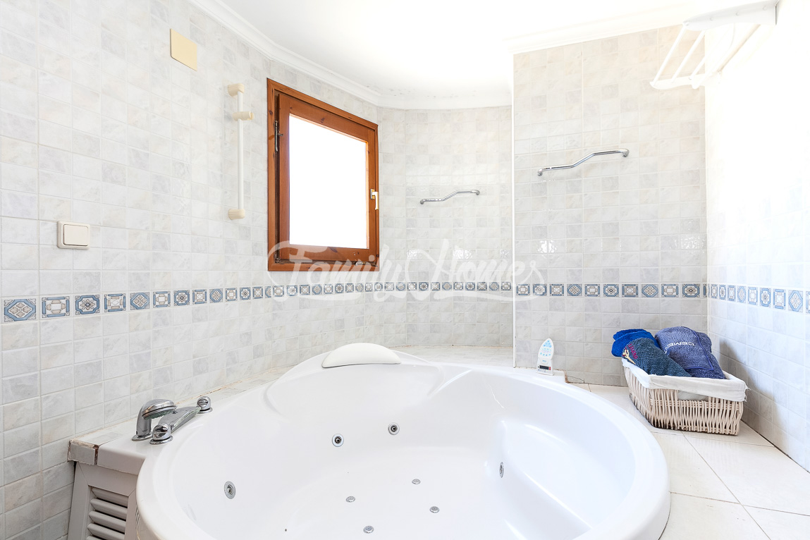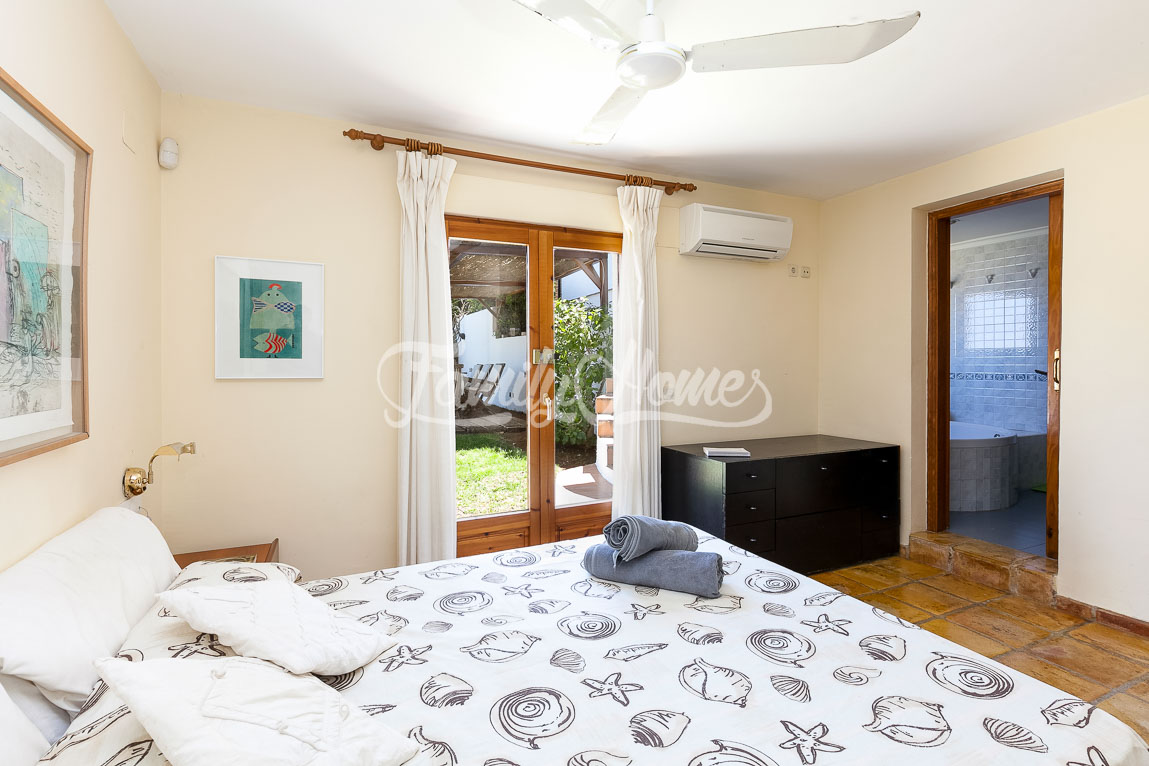 En la planta inferior, y con acceso por escalera de caracol desde la planta superior, se sitúa la habitación principal con cama de matrimonio de 160 cm y amplio baño ensuite con gran bañera hidromasaje. Salida directa al jardín y a la piscina.