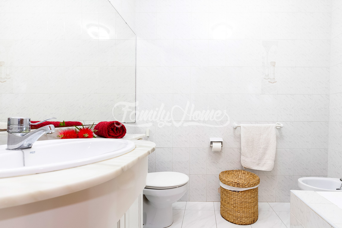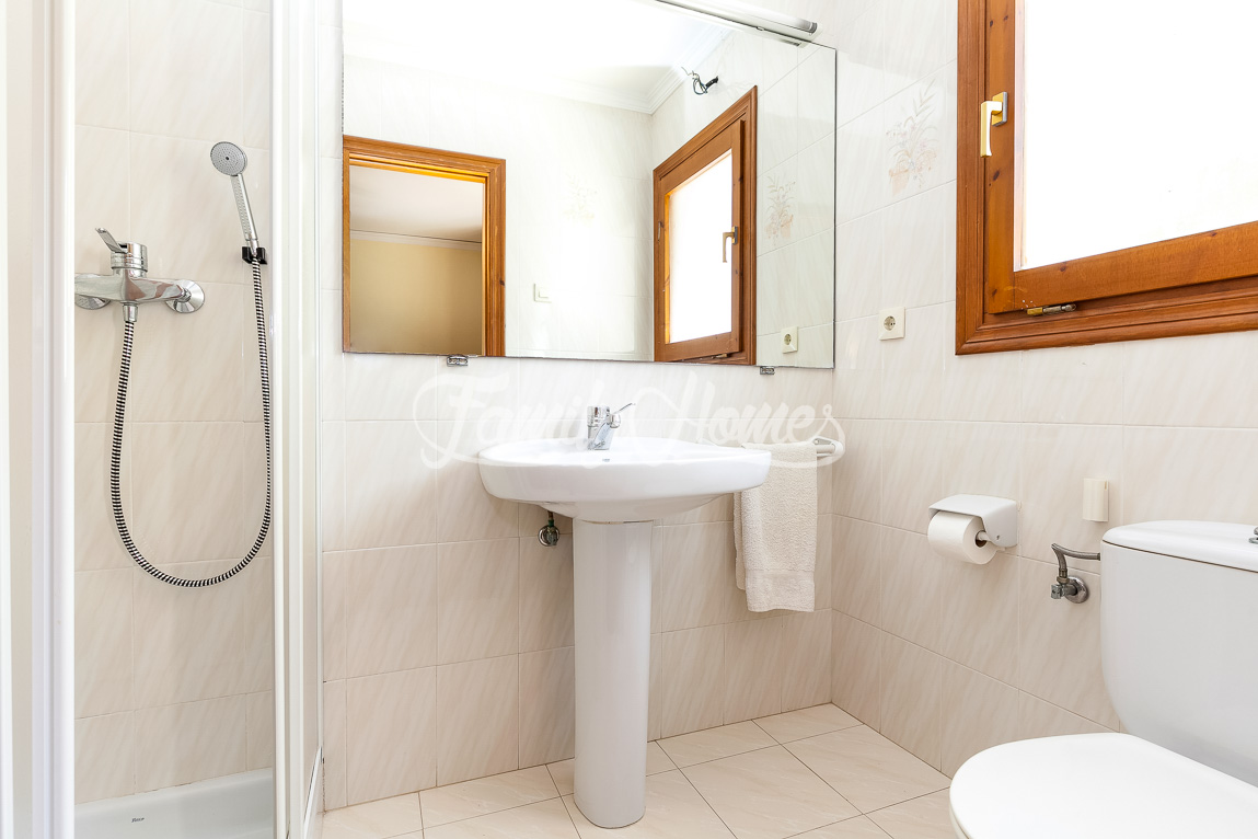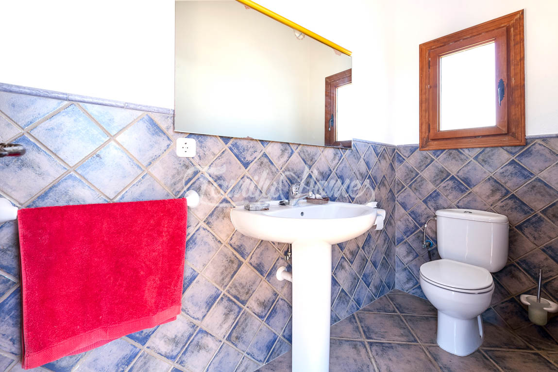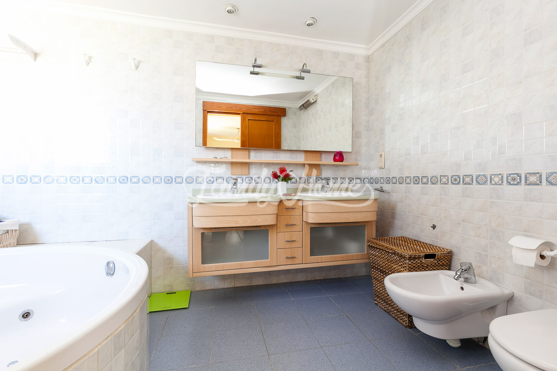En la planta inferior, y con acceso por escalera de caracol desde la planta superior, se sitúa la habitación principal con cama de matrimonio de 160 cm y amplio baño ensuite con gran bañera hidromasaje. Salida directa al jardín y a la piscina.
