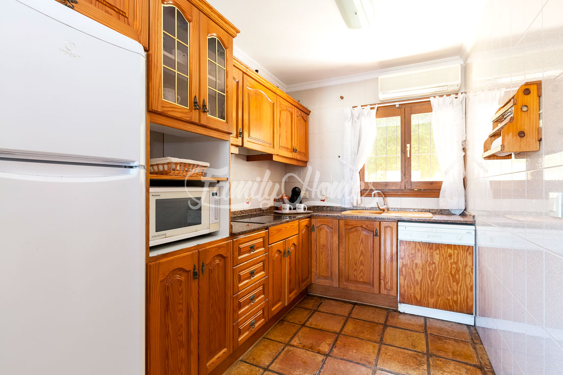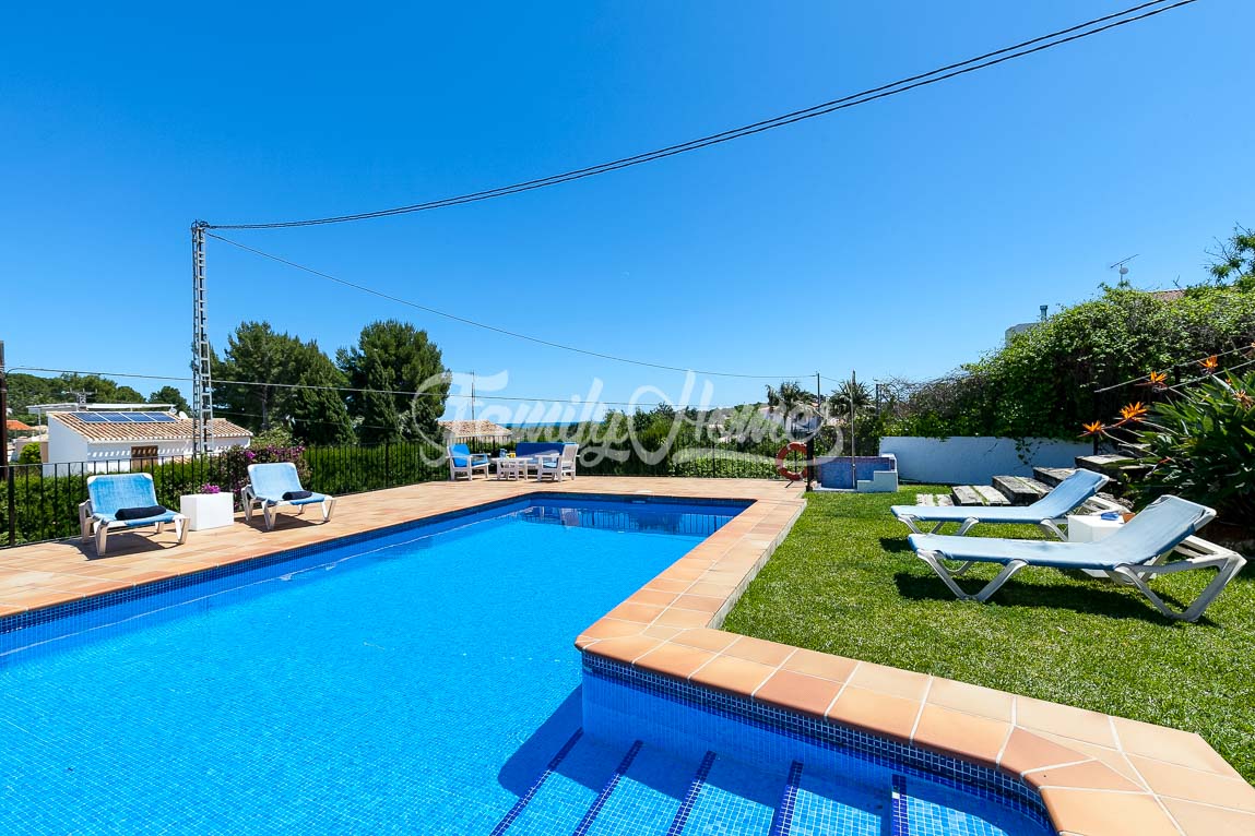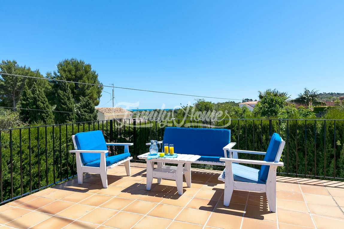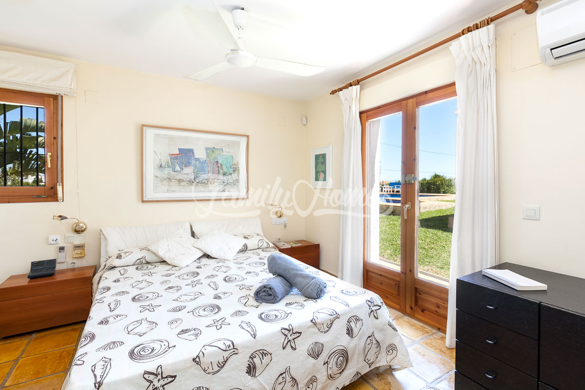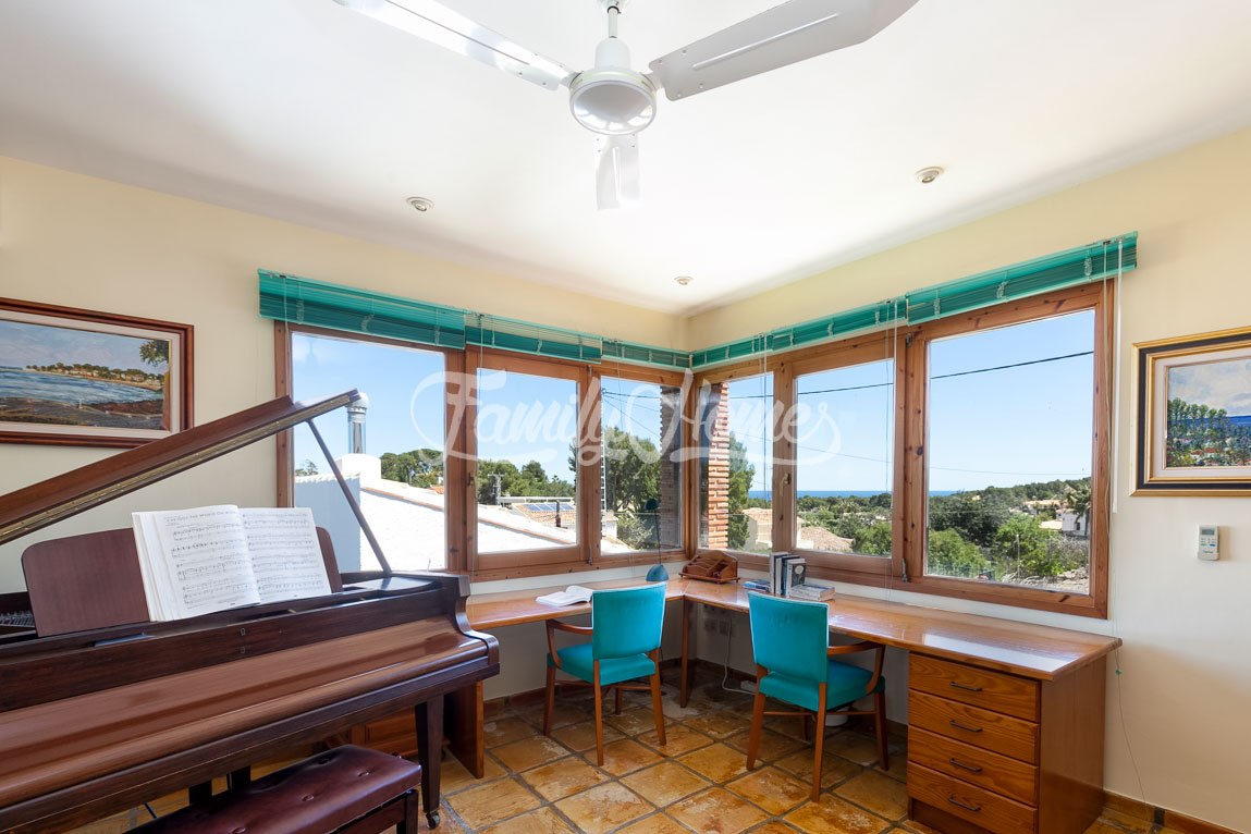 Villa con mucho encanto ubicada en una de las mejores zonas de Dénia, capacidad para 6 personas. Distribuida en dos plantas. En la planta superior, encontramos un amplio salón con TV, música, zona de estar y salida a la terraza cubierta equipada con mobiliario de exterior ideal para comer y jardín. Comedor con vista al mar con capacidad para 6 comensales junto a cocina abierta perfectamente equipada con lavavajillas. Dos habitaciones dobles, una con cama de 150 cm y baño ensuite con ducha y una habitación doble con 2 camas de 90 cm (una de ellas nido) y un baño con bañera. Luminoso estudio con piano, librería y gran ventanal con vista a la piscina y al mar, ideal para disfrutar leyendo y desconectar.